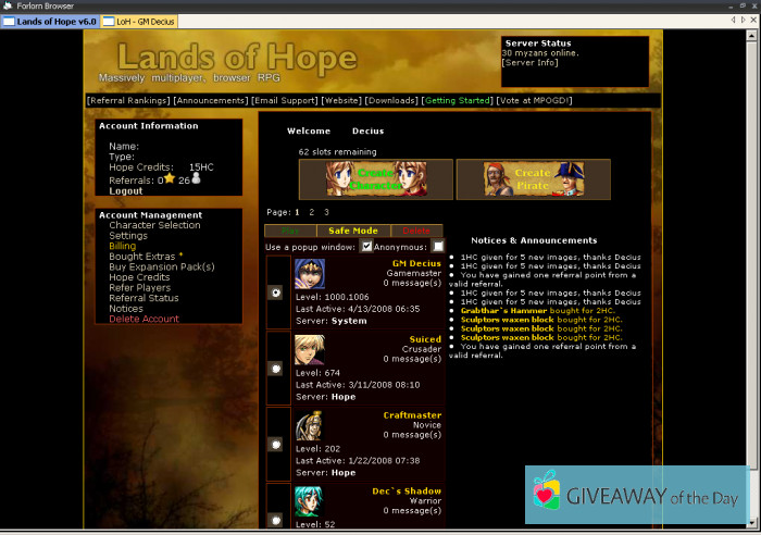 Lands of Hope 6.0 is provided free of charge on Download Basket. The fact that Forlorn Games is the developer of this game is well-known by its users. Based on the community opinions, the weak side of it is: it is not user-friendly.