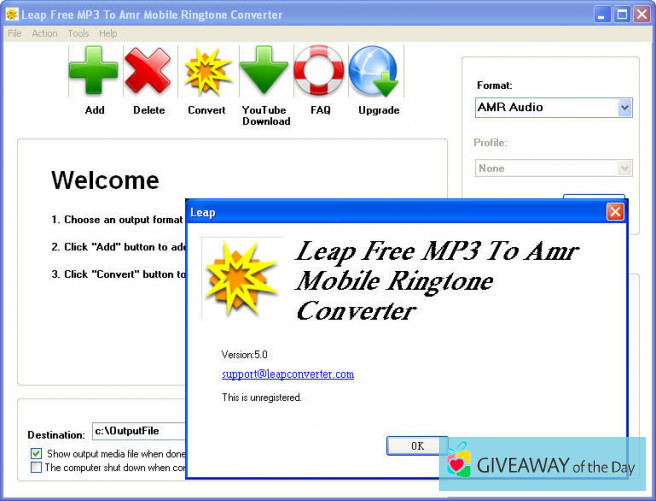 A free version of Leap Free MP3 To Amr Mobile Ringtone Converter 5.0 can be found on our software library. The copyright of the software belongs to Leapconverter Software, Inc. Users leave reviews pointing out that the plus of it is: it is fast. The most popular version of this software is 5.0. The built-in antivirus system indicates that the program is virus free. The most frequent name of installation file for this tool that can be found on our database is: LeapConvert.exe.