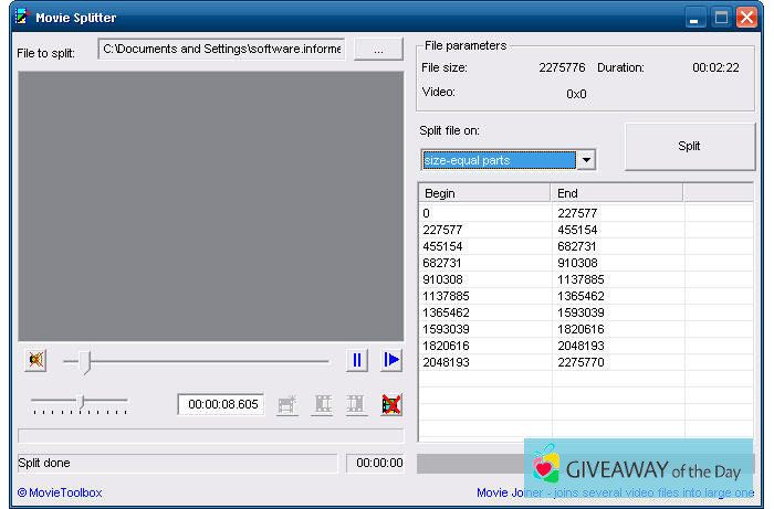 Our users often look for the installation file for the tool with the following name: splitter.exe. MovieToolbox is the creator of this tool. The software can be launched on Windows XP/7/8 32-bit.