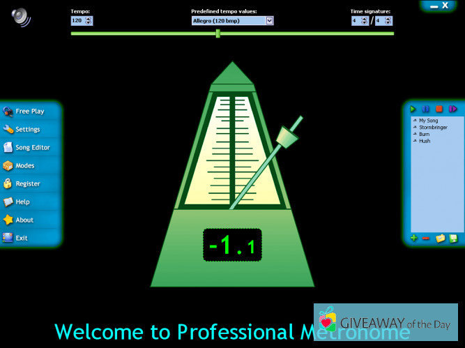 Professional Metronome 1.9 is provided for free on Download Basket. The most popular versions of the tool that our community members choose are 1.9, 1.8 and 1.7. The built-in antivirus system reports that this downloadable file is secure. The fact that Storm Software is the developer of it is well-known by its users. This filename is among the most common ones for this program: Professional Metronome.exe. This tool can be installed on Windows XP/7/8 32-bit.