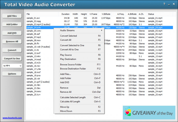 A free version of Total Video Audio Converter 4.1.2.1649 can be found on our website. Notice that the software can be installed on the following OSs: Windows XP/Vista/7/8/10/11 32-bit. The copyright holder of it is Hoo Technologies.