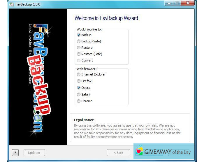 Our software library offers FavBackup 2.1.3 that can be downloaded for free. The copyright of this program belongs to FavBrowser. Our antivirus system always checks the software for spyware. It scanned this program and reported that it is 100% secure.
