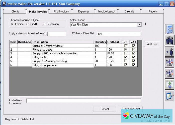 The most popular version of the tool that our community members choose is 1.0. Databiz Ltd is the developer of this tool. Invoice Maker refers to Productivity, according to its main purpose. Our antivirus system always checks the software for spyware. It scanned Invoice Maker and reported that it is clean to use. It is designed to work with Windows XP/Vista/7/8 32-bit.