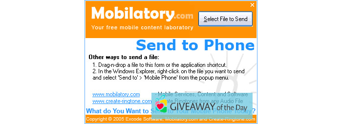 A free version of Send To Phone 2.1 can be found on our website. According to the system requirements, the software is available for the following OSs: Windows XP/Vista/7/8/10 32-bit. The most popular version of this software is 2.1.