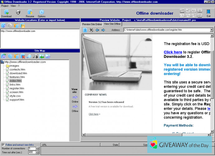 The most popular and frequently downloaded file of this program is: offline.exe. According to the system requirements, Offline Downloader is available for the following OSs: Windows XP/Vista/7/8/10 32-bit. The fact that InternetSoft Corporation is the creator of the software is well-known by its users. The most popular versions of this program are 3.8, 3.6 and 3.5.
