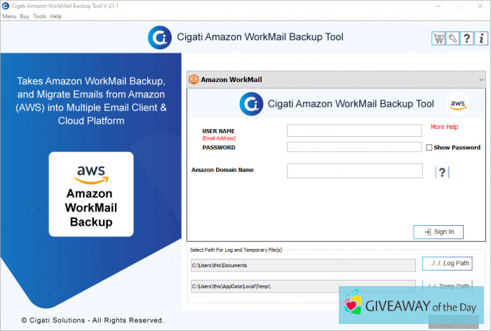 Our software library provides Cigati Amazon WorkMail Backup Tool 23.5 that can be downloaded free of charge. The built-in antivirus system reports that this downloadable file is safe. The software is related to Communication, according to its main purpose. The size of the downloadable installation file is about 156.1 MB. The copyright holder of this program is Cigati Solutions.