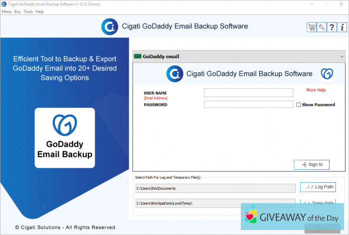 A free version of Cigati GoDaddy Email Backup Tool 21.10 can be found on our software library. Our antivirus system always scans the downloadable files for spyware. It scanned it and reported that it is virus free. The copyright of it belongs to Cigati Solutions. You can find it in the Communication category on our website.
