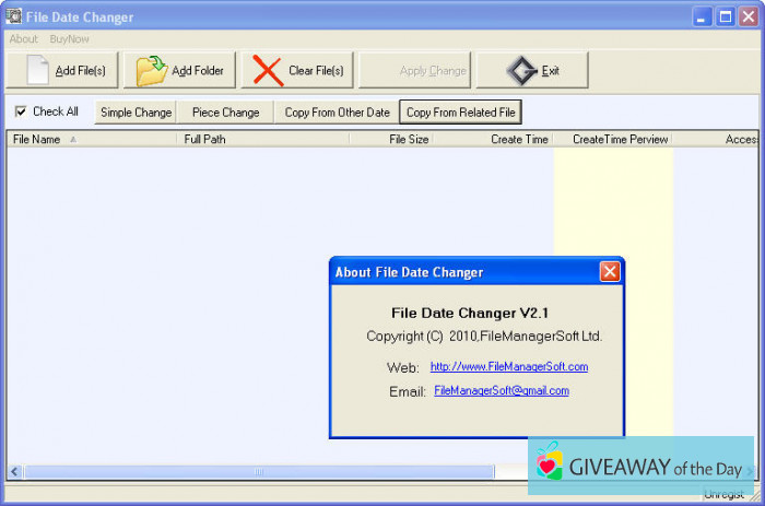 The most common name of installation file for this program that can be found on our database is: FileDateChanger.exe. The downloadable file of the latest program version requires 751 KB of free space. According to the information on our software library the most popular versions of this program are: 2.1 and 2.0.