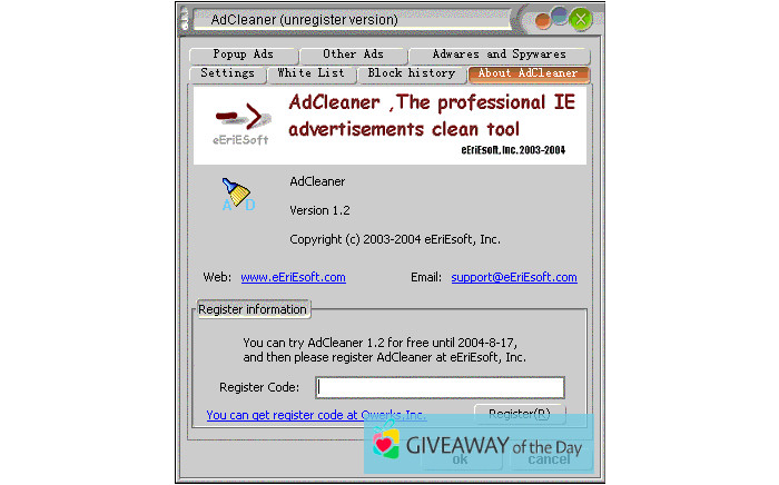A free version of AdCleaner 1.2 can be found on our website. This tool can be installed on Windows XP/Vista/7/8/10 32-bit. The copyright holder of this program is eEriEsoft,Inc.