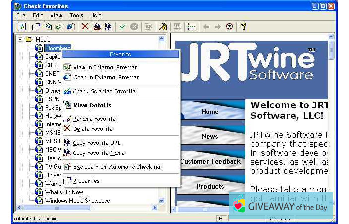 As users state, the main disadvantages of this tool are: this tool has a poor interface and doesn't have a help file. The most popular version of the software is 1.7. JRTwine Software, LLC is the creator of this tool. This installation fileis often used to set up the program: CheckFavorites.exe.