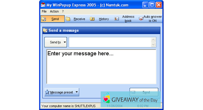 Our software library provides My WinPopup Express 2009.03 that can be downloaded for free. This program is included in Communication, according to its main purpose. Namtuk is the creator of this program.