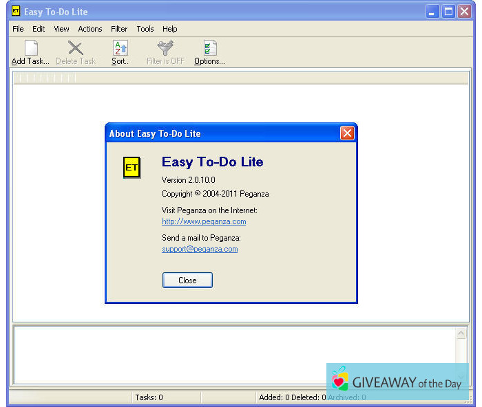 This installation fileis often used to install the software: ETODO.exe. The copyright holder of the software is Peganza. Users leave reviews stating that the decisive benefit of the software is: the software is easy to use. According to the information on our website the most popular version of this program is: 2.0. You can find Easy To-Do Lite in the Productivity category on our software library.