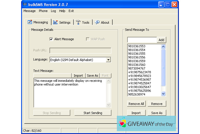 BulkSMS is a software product which is commonly known as BULK SMS.exe, bulkSMS.exe, BulkSMS_Delhi.exe, eCOSMS.exe and Messenger.exe, etc. According to the information on our website the most popular versions of the software are: 2.0 and 1.0. This program is designed to work with Windows XP/7 32-bit. You can find this program in the System Utilities category on our software library. IG Logix Softech Pvt Ltd is the developer of this tool.