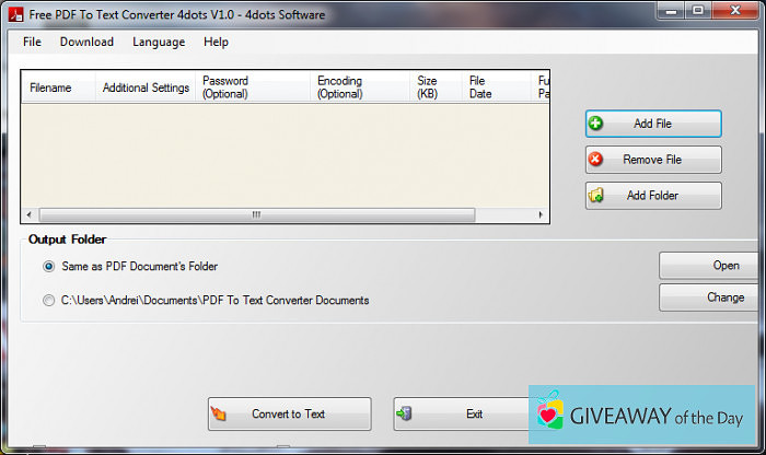 This program is found among Productivity, according to its main purpose. Please note that Free PDF To Text Converter is developed by 4dots Software. This tool can be launched on Windows XP/Vista/7/8/10 32-bit. The most popular version of the tool is 1.0.