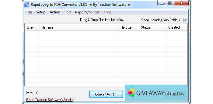 A free version of Rapid Jpeg to PDF Converter 1.04 can be found on our website. The program has been checked by our built-in antivirus system, the report shows that it is absolutely safe. The copyright of the software belongs to Traction Software.