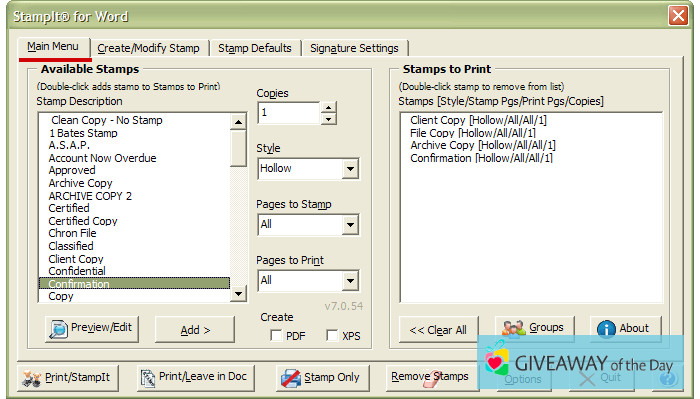 StampIt for Word 7.0.56 is provided free of charge on our software library. According to the system requirements, this program is available for the following OSs: Windows XP/7 32-bit. The most popular version of the software that our community members download is 7.0.