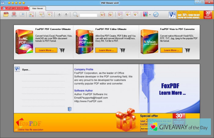 This filename is among the most common ones for this software: VSDViewer.exe. The software is included in Productivity, according to its main functionality. It can be installed on Windows XP/7/8/10 32-bit. Our antivirus system always scans the programs for spyware. It scanned it and reported that it is 100% secure. Please note that this program is developed by FoxPDF Corporation.