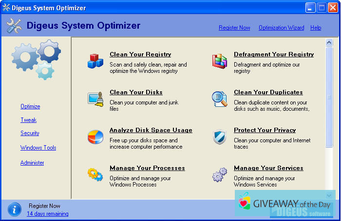A free version of Digeus System Optimizer 8.2 can be found on our website. The most frequent name of installation file for the program that can be found on our database is: System Optimizer.exe. The downloadable file of this latest software version requires 7.1 MB of free space.