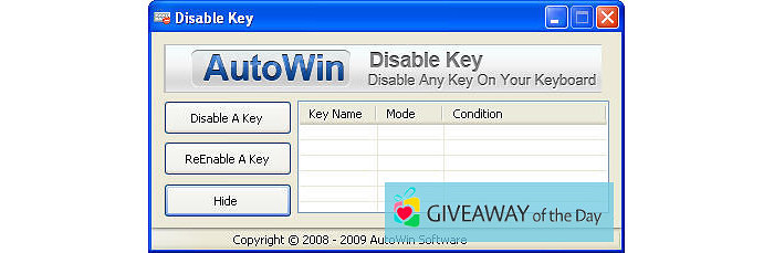 This tool can be installed on Windows XP/7/8/10/11 32-bit. Our users often download the installation file for the software with the following name: DisableKey.exe. The copyright holder of it is AutoWin, Inc. The built-in antivirus system shows that the program is virus free. Users leave reviews stating that this tool possesses such a disadvantage as it's overpriced.