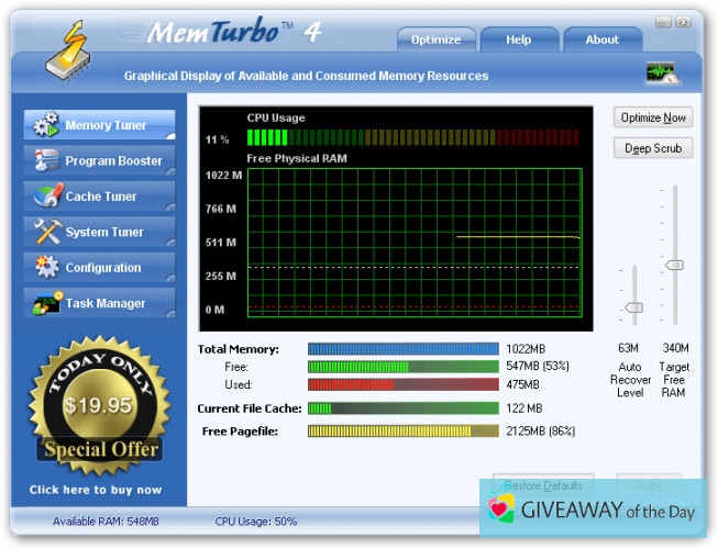 A free version of MemTurbo 4.1.2817.473 can be found on our software library. Our antivirus system always scans the software for malware. It scanned MemTurbo and reported that it is virus free.