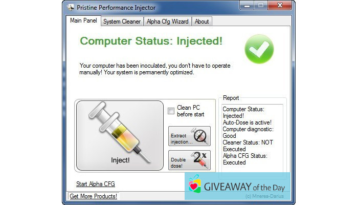 As users mention, Pristine Performance Injector possesses such a disadvantage as Pristine Performance Injector does not run. The copyright holder of Pristine Performance Injector is Mnerea-Darius. It can be launched on Windows XP/Vista/7/8/10 32-bit. The most popular version of the software is 1.5.