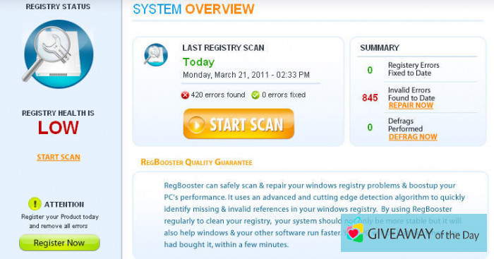 Our website provides RegBooster 2.0 that can be downloaded free of charge. As users indicate, the main drawback of the software is: it is very slow. It is found among System Utilities, according to its main functionality. The most popular version of this software is 2.0. The copyright of the software belongs to RegBooster. The most frequent name of installation file for this software that can be found on our database is: RegBooster.exe. The built-in antivirus system reports that the program is safe.