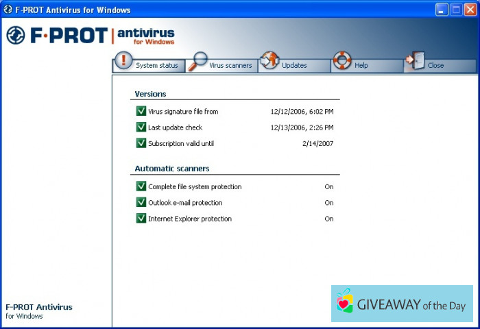A free version of F-PROT Antivirus for Windows 6.0.9.6 can be found on our software library. The most popular version of the tool that our community members download is 6.0.