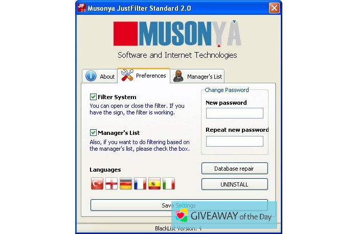 Musonya JustFilter Standard 2.0.0.7 is available for free on Download Basket. It is a program which is frequently known as JFS_PREF.exe. Our antivirus system always checks the software for spyware. It scanned Musonya JustFilter Standard and reported that it is clean to use.