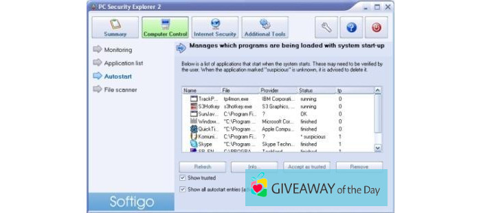 A free version of PC Security Explorer 2.0 can be found on our website. Users leave reviews saying that the strong point of this program is: it is very easy to use. The copyright holder of this program is Softigo.com. This program is a software product which is commonly known as pcse.exe. The most popular versions of this software are 2.0 and 2. The software has been checked by our built-in antivirus system, the report indicates that it is 100% secure.