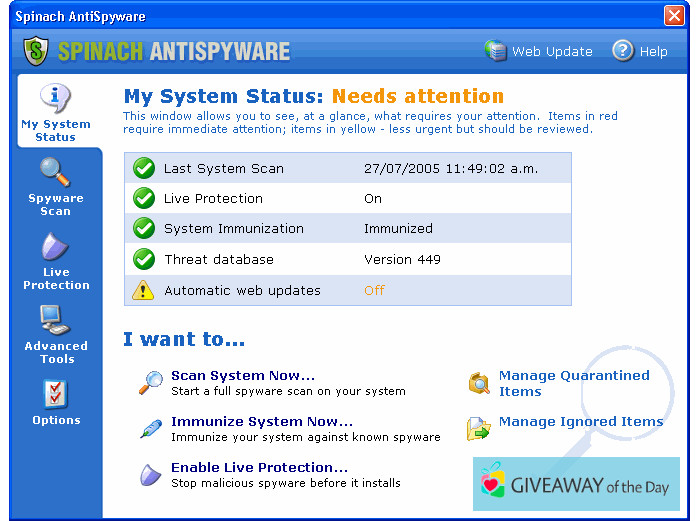 The copyright holder of Spinach AntiSpyware is Spinach Software. Some users state that it features such strong sides as it has a nice looking interface and is simple and efficient. The most popular version of this tool is 1.5.
