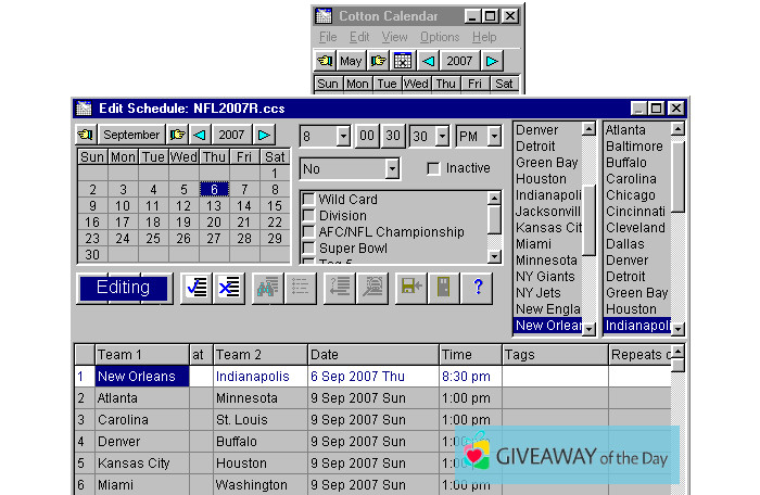 A free version of Cotton Calendar 1.81 can be found on our website. The most popular and frequently downloaded files of this software are: CottnCal.exe and CottnCalNT.exe. According to the information on our website the most popular versions of this program are: 1.8 and 1.7. You can find it in the Productivity category on our website. The copyright of this tool belongs to 100% Cotton Software. This program has been scanned by our built-in antivirus system, the report shows that this tool is virus free.