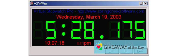 The most popular versions of this program that our community members install are 4.0, 3.2 and 3.1. The built-in antivirus system indicates that the downloadable file is safe. Users leave reviews saying that this program features such a plus as it is very easy to use. Please note that Virtual Stopwatch Pro is developed by Spring Creek Software Company. The software can be installed on Windows XP/7/8/10 32-bit.
