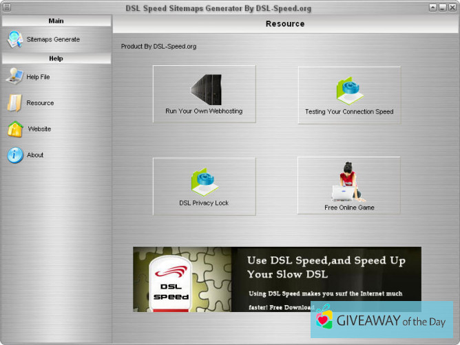 The free DSL Speed Sitemaps Generator 1.0 download is provided on our website. The most popular and frequently downloaded file of this software is: sm.exe. This program can be installed on Windows XP/7/8 32-bit. The copyright of the software belongs to DSL-SPEED.ORG.