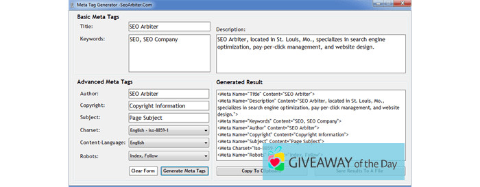 The free Meta Tag Generator 1.1 download is provided on our website. Our antivirus system always checks the programs for malware. It scanned Meta Tag Generator and reported that it is clean to use. The fact that SEO Arbiter is the creator of this tool is well-known by its users.