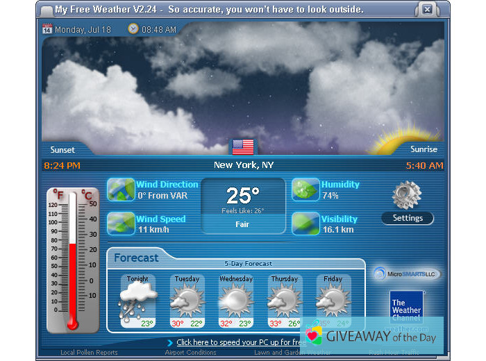 The most widespread installation file name of the tool is My Free Weather.exe. This software has been scanned by our built-in antivirus system, the report shows that the software is virus free. MicroSmarts LLC. is the developer of this tool. My Free Weather refers to Personalization, according to its main functionality.